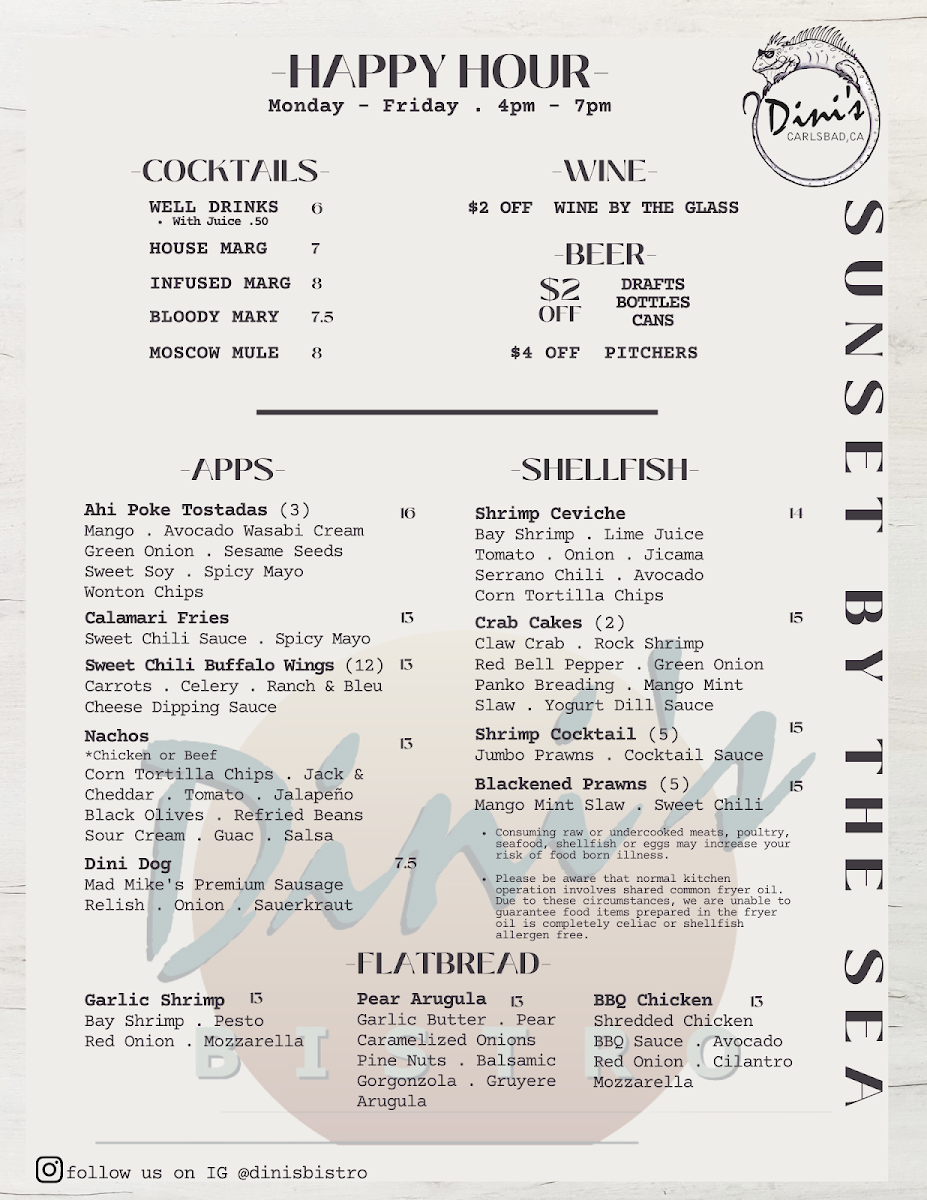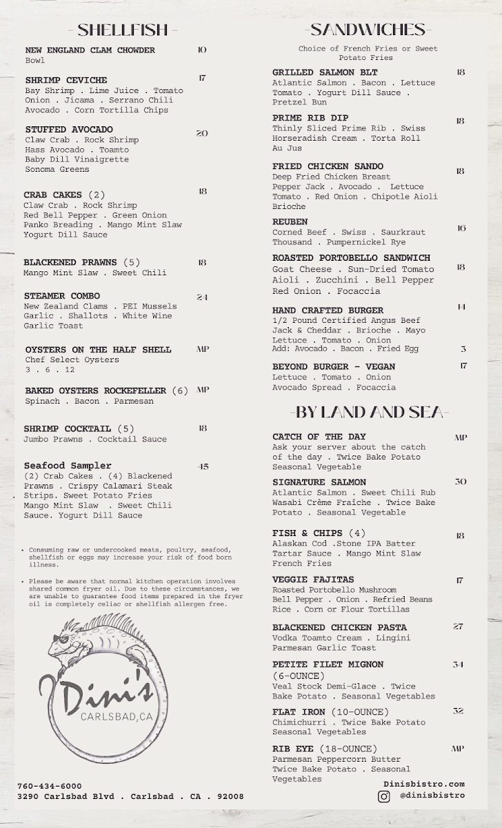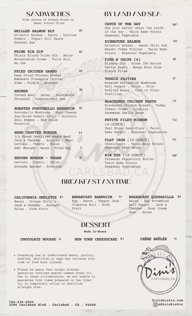 Welcome to Dini's By The Sea, where culinary excellence meets breathtaking ocean views in Carlsbad, California. This charming eatery not only tantalizes the taste buds but also offers a delightful ambiance perfect for any dining occasion.